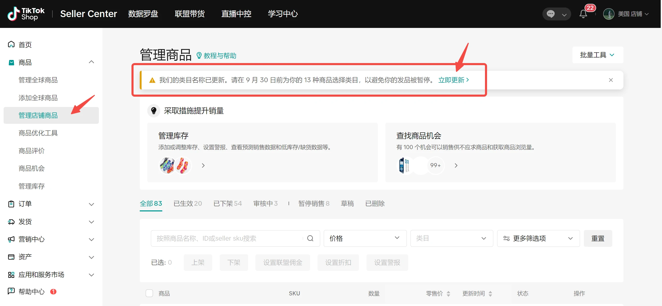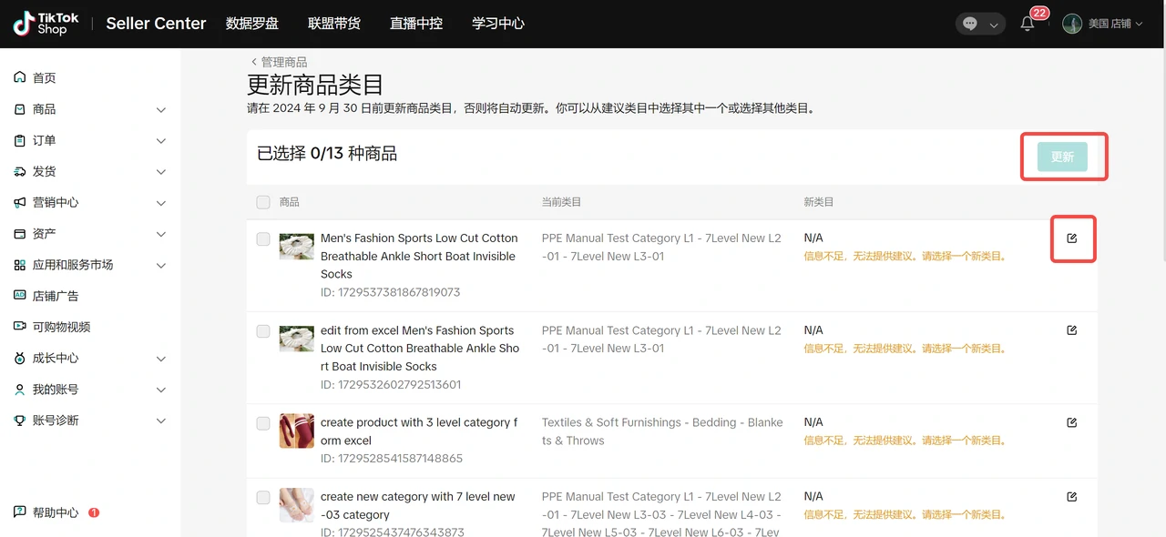 1、批量更新:切换至US店铺,在【管理店铺商品】(Manage Products)页面,点击上方banner中的“立即更新”(Update now)跳转到【更新商品类目】(Update Product Category),勾选商品点击右上角“更新”2、单个更新:在【管理全球商品】(Manage Global Products)编辑修改商品信息