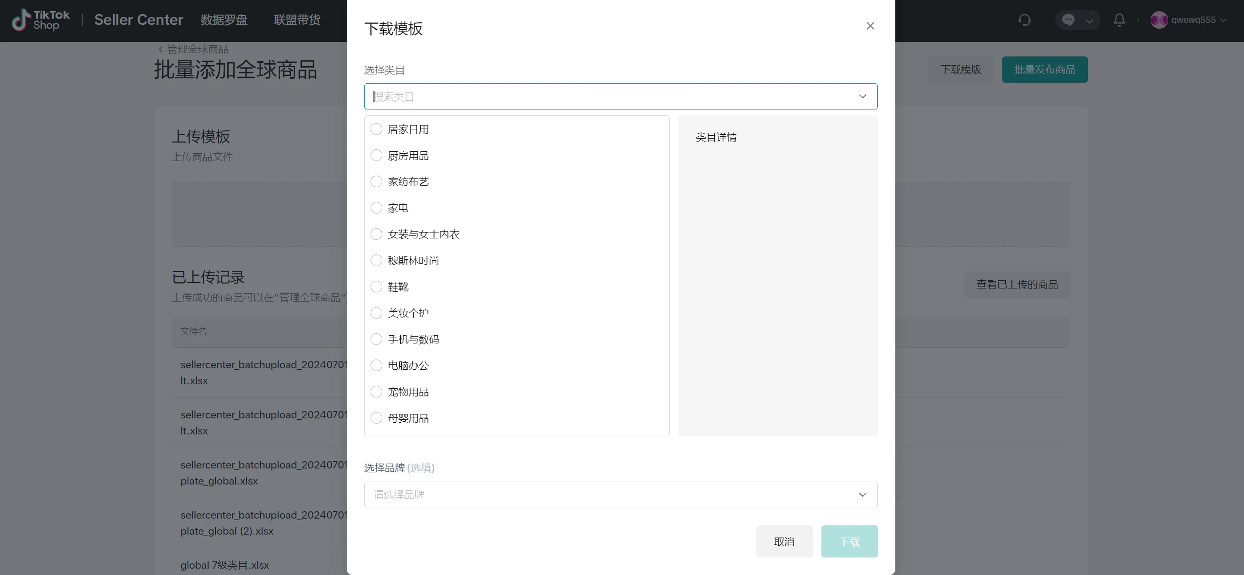 1、通过路径 管理全球商品->批量工具->批量添加全球商品,选择一个产品类目,下载更新后的模板