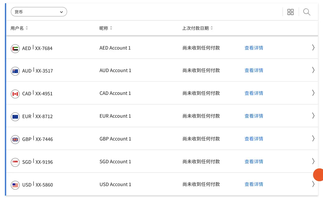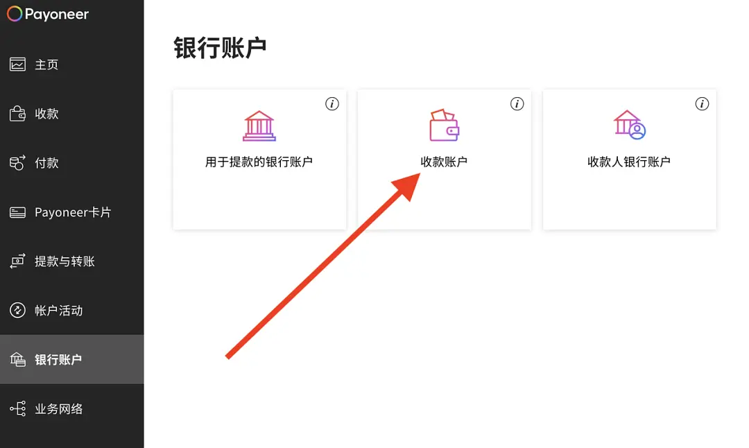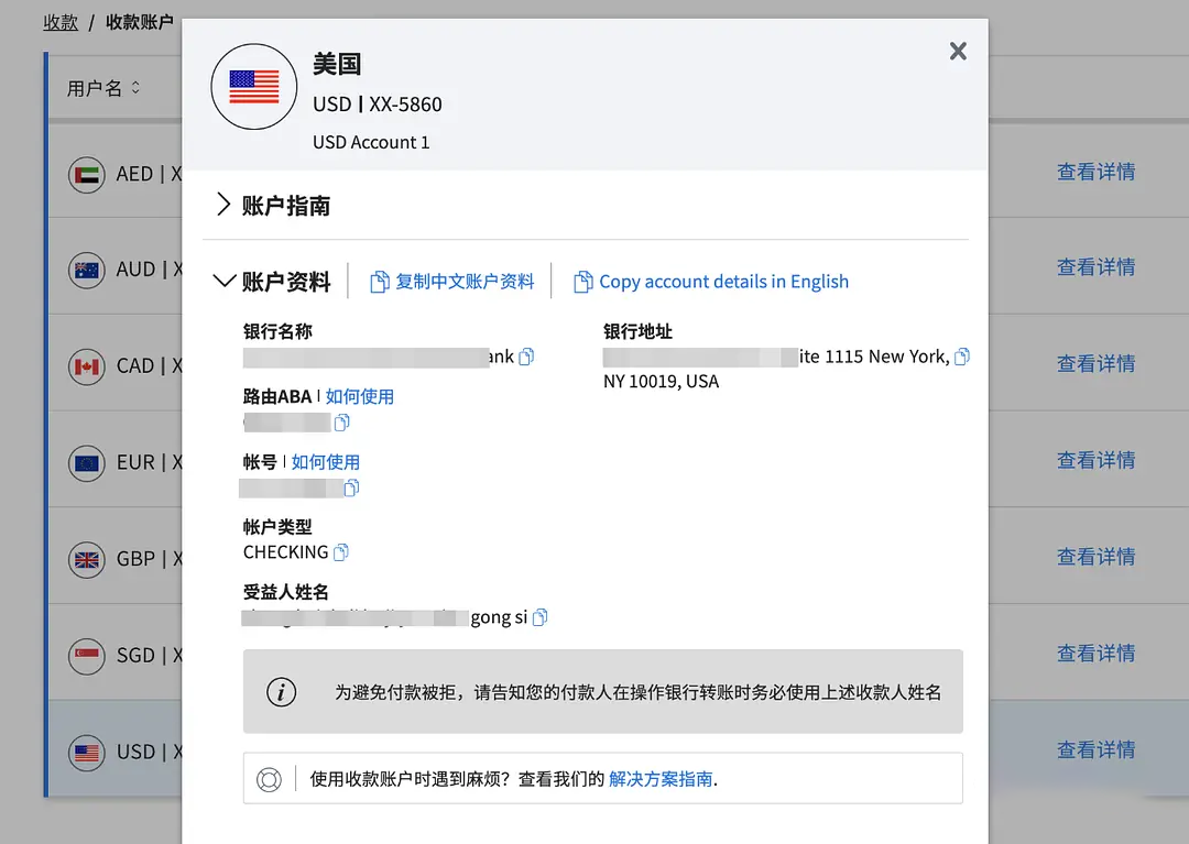 最后再填写下用于提现的国内银行卡信息,提交后应该会收到2封邮件,一封是验证电子邮件,另一封是上传身份证照片,用手机拍照提交后等待审核,一般2天内通过。通过后它就会分配给我们一些各个国家货币的银行账号,如果没看到银行账号,请点击“收款”里的”申请账户”按钮,可能要填个简单的服务问卷。点击“查看详情”就能看到账号的卡号等信息。