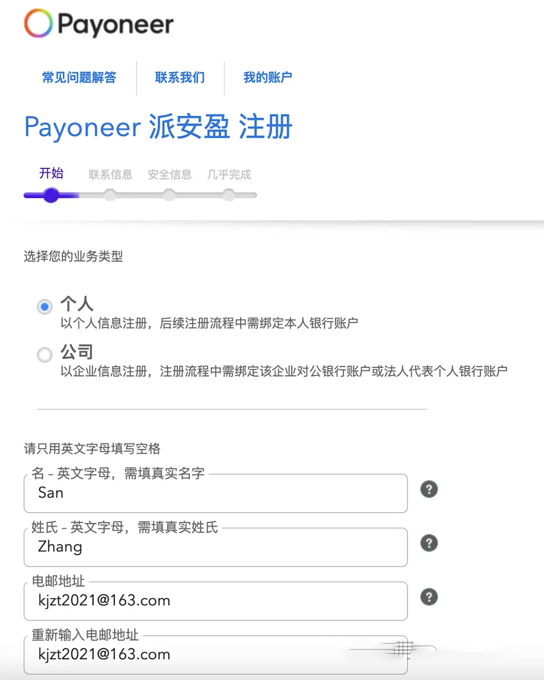 登录Payoneer(派安盈)官网 http://www.payoneer.com,选择以“公司”注册。按照步填写信息,与TkTok Shop主体注册信息一样,确保都真实准确,请用英文字母填写