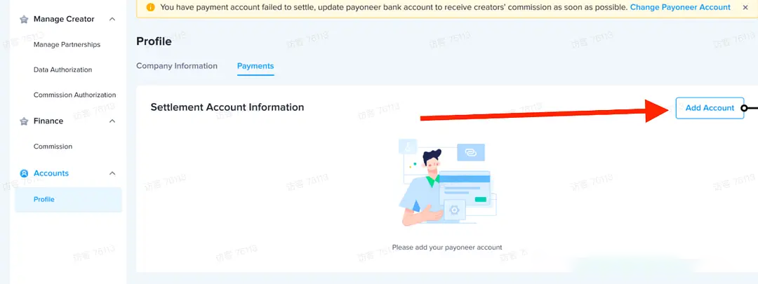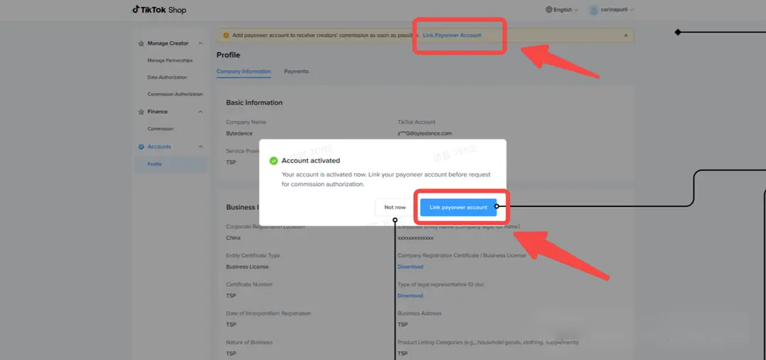通过路径:Account-profile-company information激活账号后,可以通过弹窗或顶部的小黄条进入payoneer账号绑定页面